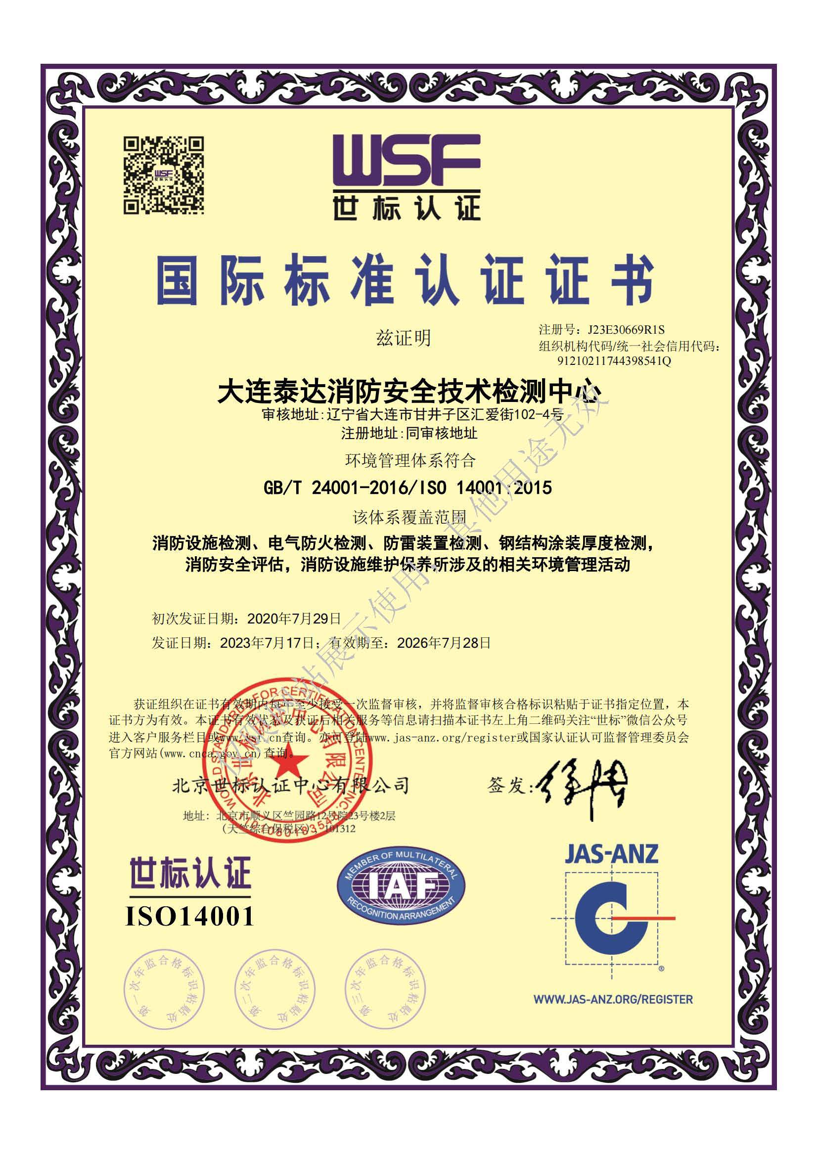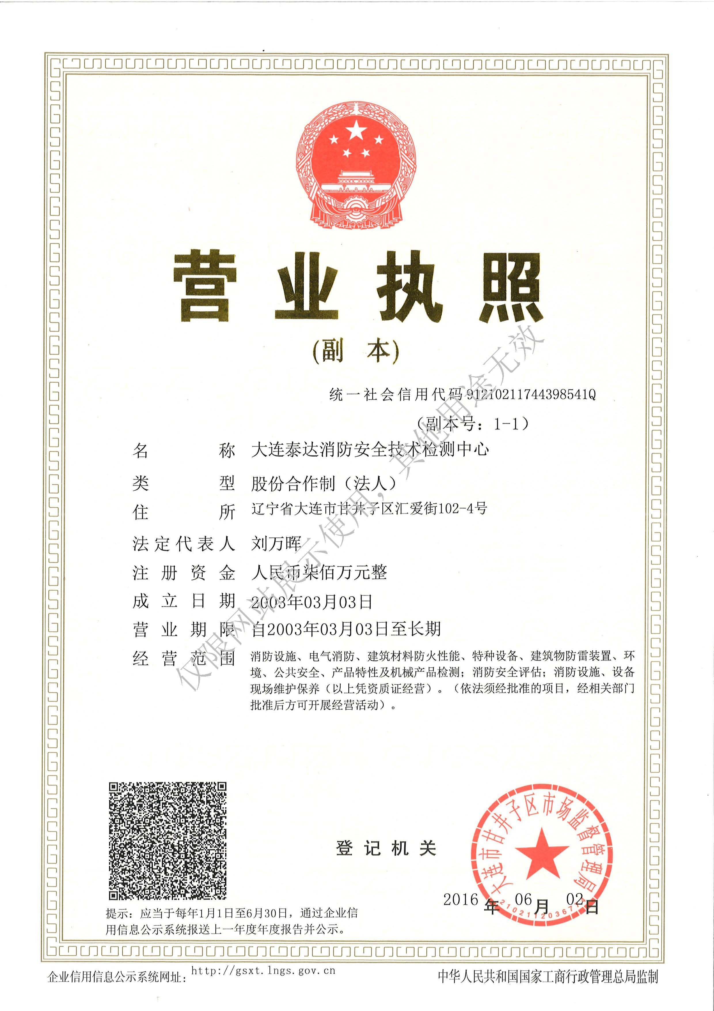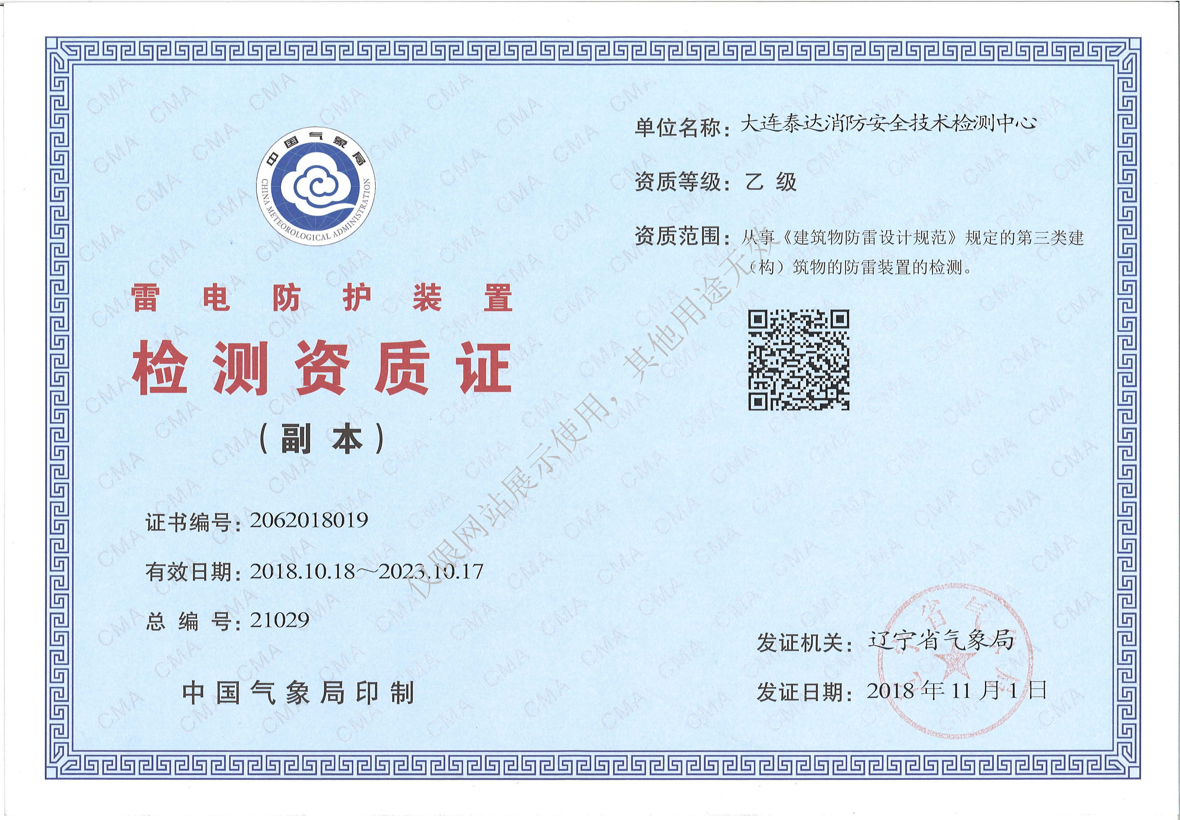 · 是經(jīng)“社會(huì)消防技術(shù)服務(wù)信息系統(tǒng)”備案并公示的消防技術(shù)服務(wù)機(jī)構(gòu),已取得中國氣象局頒發(fā)的雷電防護(hù)裝置檢測(cè)資質(zhì)證書、遼寧省質(zhì)量技術(shù)監(jiān)督局審核批準(zhǔn)的檢驗(yàn)檢測(cè)機(jī)構(gòu)資質(zhì)認(rèn)定證書(CMA)及包括消防檢測(cè)、電氣檢測(cè)、雷電防護(hù)裝置檢測(cè)、防火涂層厚度檢測(cè)等在內(nèi)的200余項(xiàng)檢驗(yàn)檢測(cè)能力,取得大連市應(yīng)急管理局頒發(fā)的安全生產(chǎn)標(biāo)準(zhǔn)化證書,獲得質(zhì)量管理體系、環(huán)境管理體系、職業(yè)健康安全管理體系認(rèn)證證書,是經(jīng)備案的高新技術(shù)企業(yè),可獨(dú)立出具具有證明作用的檢測(cè)報(bào)告。